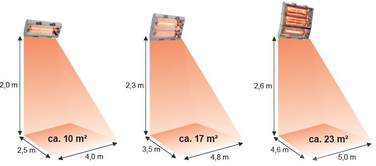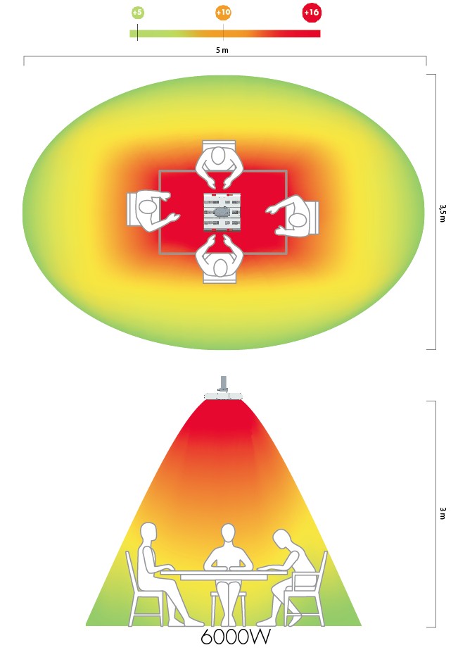Díky výkonu 6 000 W a efektivnímu reflektorovému systému pokryje jeden zářič plochu 16 až 20 metrů čtverečních – v ideálních podmínkách až 23 m². To je výkon, který standardně vyžaduje dva nebo tři menší zářiče.