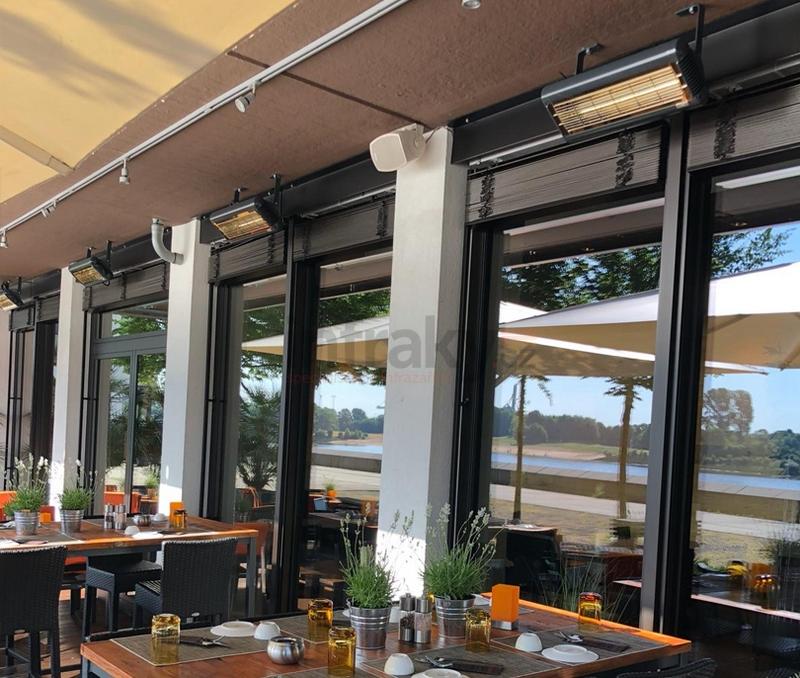 Rozsáhlé hotelové terasy: Pro hotelové terasy s vyššími přístřešky a rozsáhlými prostory, kde standardní 1,5 kW zářič nestačí pokrýt celou plochu z jedné montážní pozice.