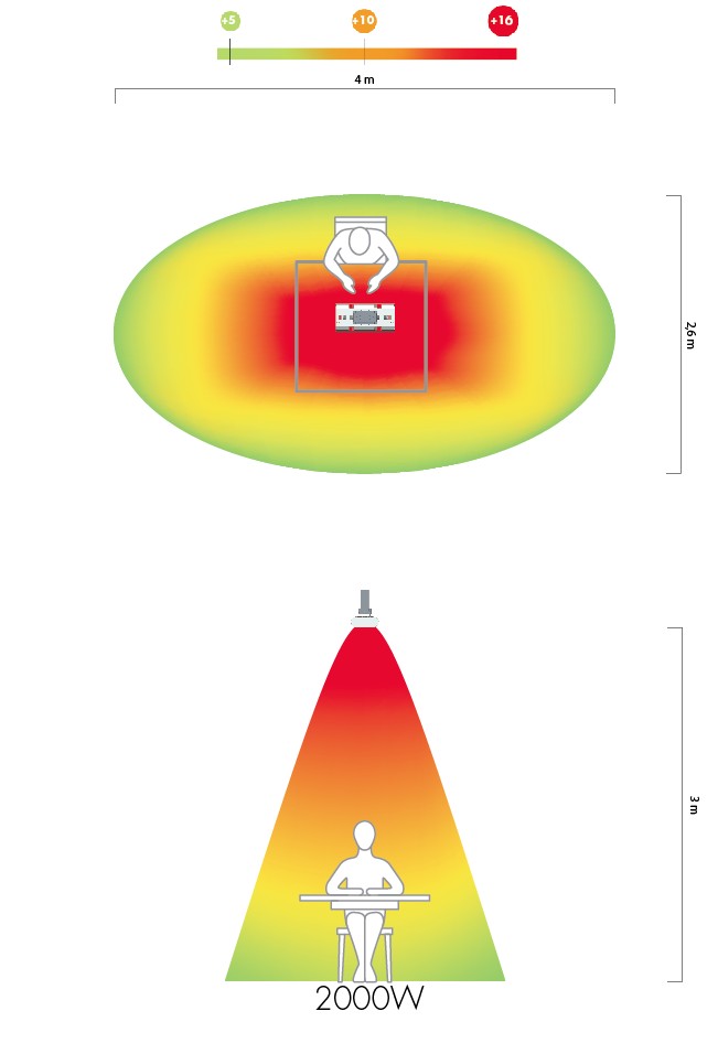 3. Výkon a pokrytí plochy V absolutních číslech pokryje 791 (2 kW) plochu 9–12 m², což je srovnatelné s variantou 792 LG (10–14 m²). Rozdíl spočívá v tom, že u varianty 792 LG dokážete rozdělit tepelný výkon do dvou nezávisle nastavitelných směrů, zatímco u 791 je teplo koncentrováno do jednoho paprsku. Pro jedno pracoviště nebo jeden stůl je 791 zcela dostatečný; pro dvě oddělené zóny je praktičtější verze 792 LG.
