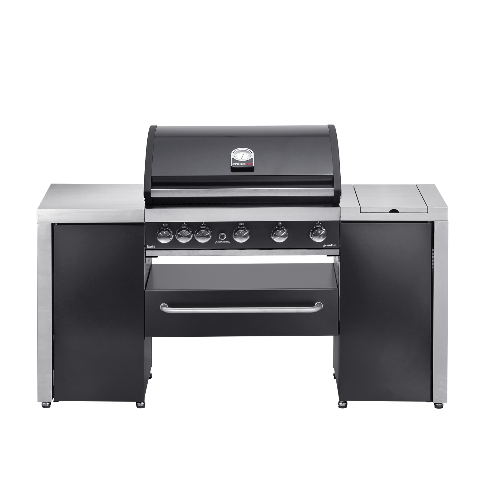 Plynový gril Grandpro MAXIM G5 ISLAND | 7 hořáků (5 hlavních nerezových + 1 zadní infračervený + 1 boční), celkový výkon 26,3 kW, celolitinový grilovací rošt 80×44,8 cm s deskou, 2 boční skříňky s pracovními deskami, police, rozšiřitelný o modulové skříňky