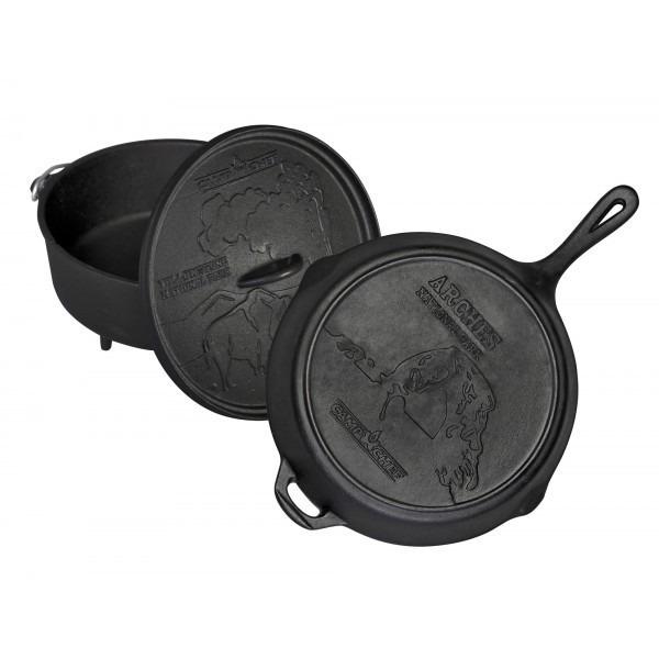 Sada litinového nádobí Camp Chef NATIONAL PARK (3-dílná) - limitovaná edice litinového nádobí k oslavě 100-ho výročí založení prvního národního parku v USA. Sada obsahuje litinový hrnec Dutch Oven 30 cm litinová pánev 30 cm s reliéfem Národního parku Arches na spodní straně litinová poklice pro obojí nádobí s reliéfem Yellowstonského národního parku na vrchní straně. Reliéfy parků Motivy si Camp Chef nevybral náhodou. Jde o dva nejoblíbenější americké národní parky. Národní park Arches ve východním Utahu je věhlasný svými více než 2000 pískovcovými oblouky. Yellowstonský národní park je zase nejstarším americkým parkem a udivuje svoji nespoutanou divočinou a geotermálními úkazy v podobě horkých pramenů a gejzírů. Nádobí je z výroby opatřeno speciální vrstvou 100% přírodních palmových olejů True Seasoned Finish, která zachovává typickou černou patinu a umožňuje jeho požití ihned po vybalení. Povrch usnadňuje čištění, chrání litinu proti korozi a brání připalování pokrmů. Tuto ochrannou vrstvu používanému nádobí dodá přírodní ochranný kondicionér na litinové nádobí Cast Iron Conditioner.